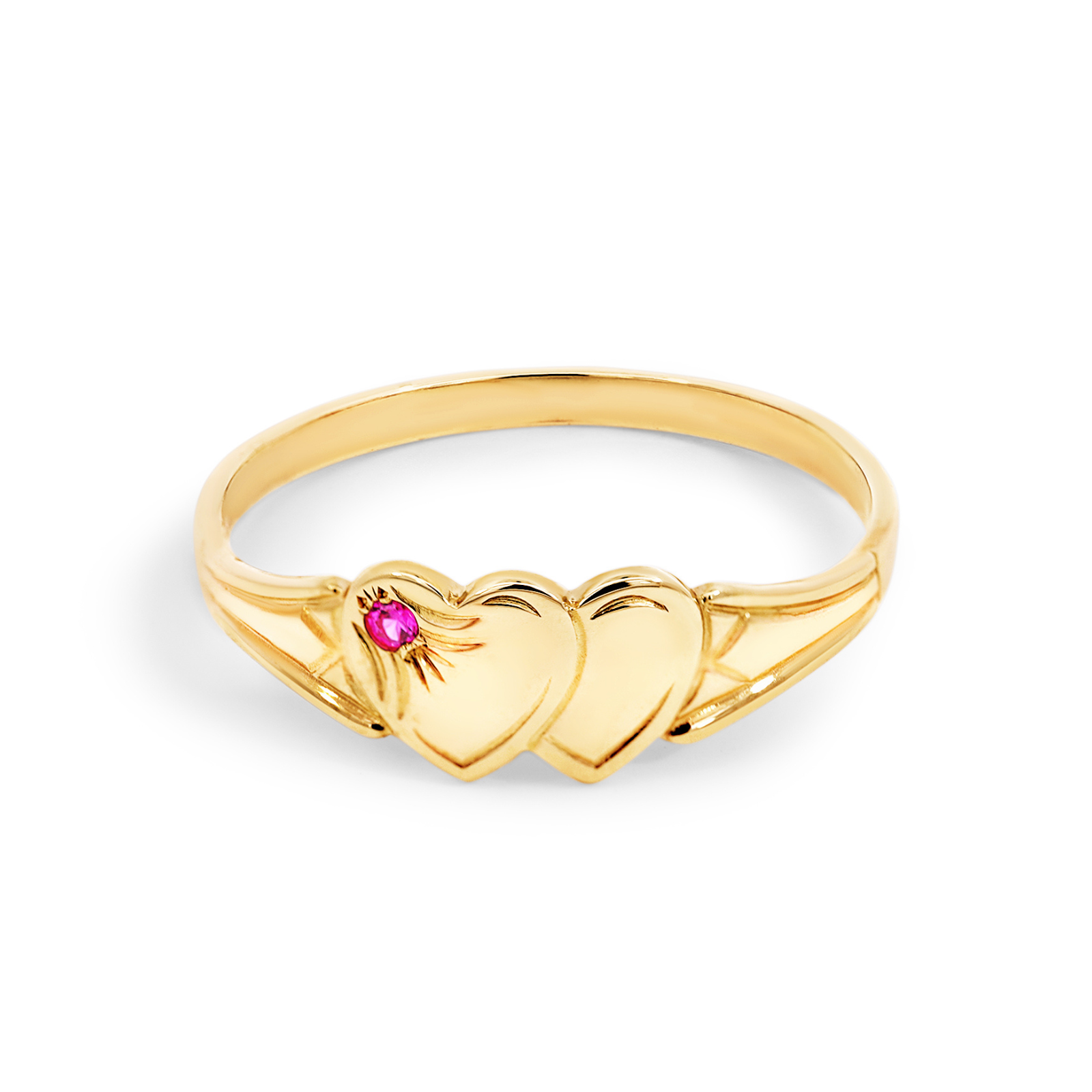 9ct Yellow Gold Double Heart Created Ruby Signet Ring