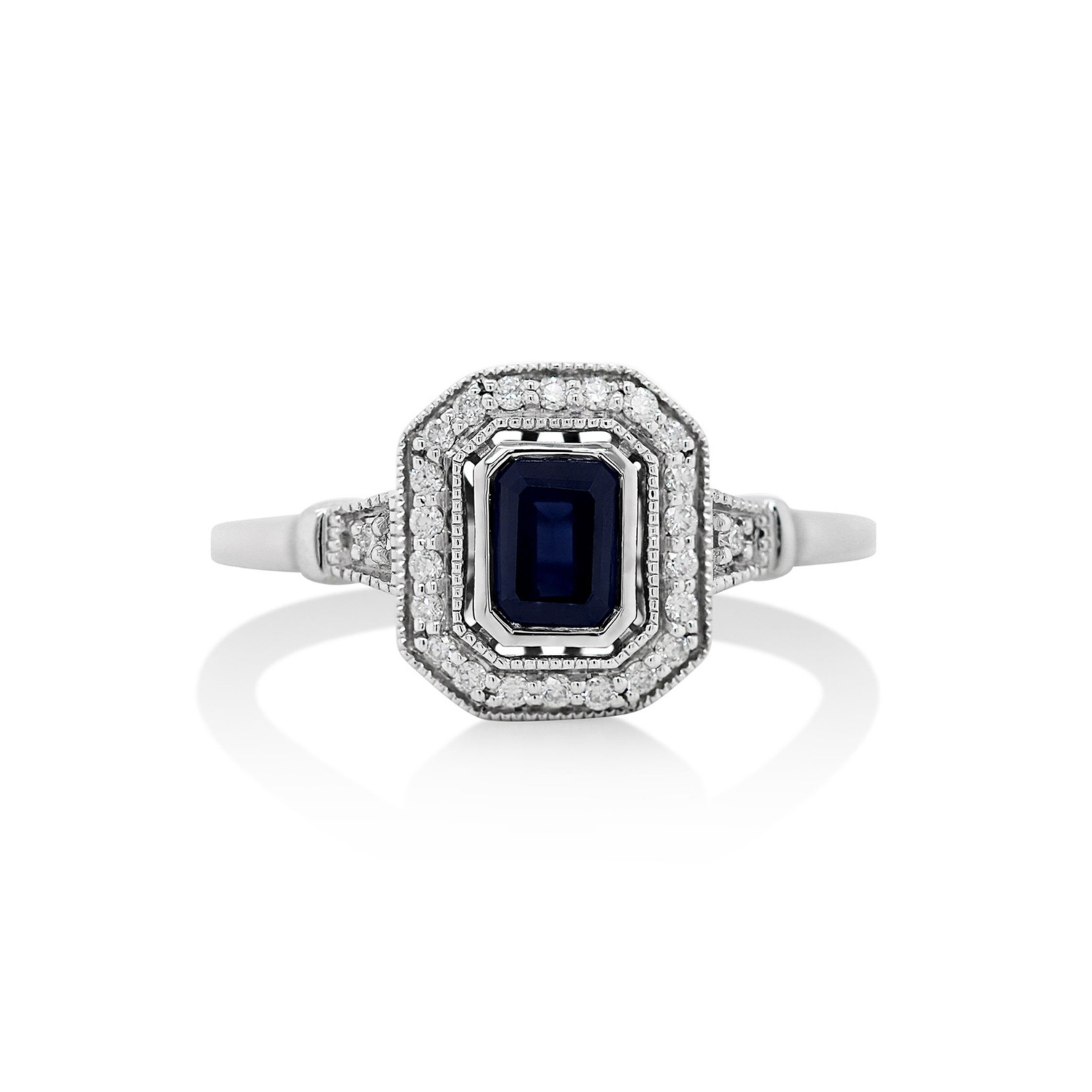 9ct White Gold Art Deco Sapphire Ring With Diamond Set Halo