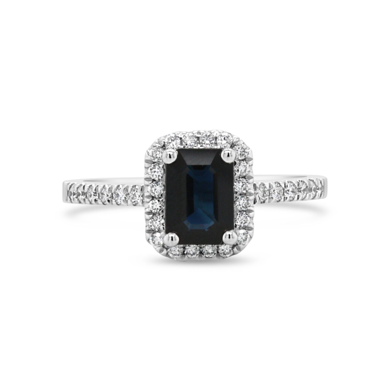 18ct White Gold Emerald Cut Sapphire Ring With Diamond Halo & Shoulders